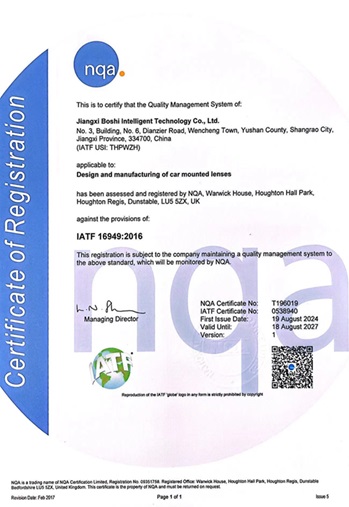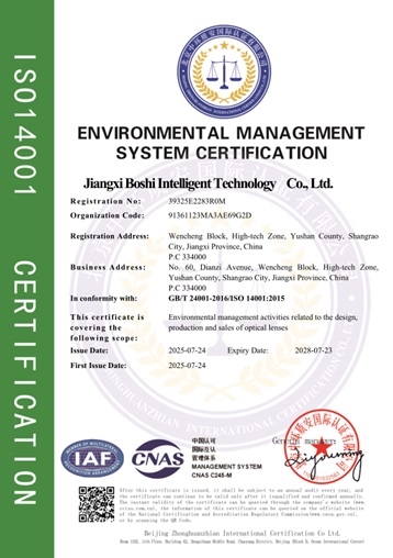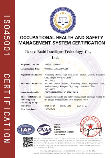 Dies bedeutet, dass Baoshi Intelligence ein standardisiertes Managementsystem eingerichtet hat, das die gesamte Kette von Forschung und Entwicklung, Herstellung, Verkauf und Kundendienst für optische Linsen abdeckt und so eine solide Grundlage für die kontinuierliche Bereitstellung qualitativ hochwertiger Produkte und Dienstleistungen legt.